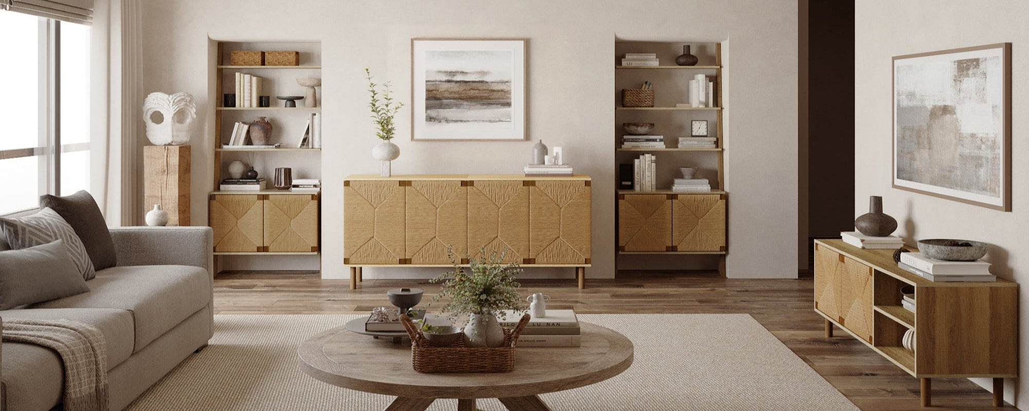 Moderne Linien treffen auf natürliche Materialien – eine harmonische Verbindung. In Kombination mit diesem warmen Holzton und handgeflochtenen Details entsteht ein zeitloser Look, der immer passt.